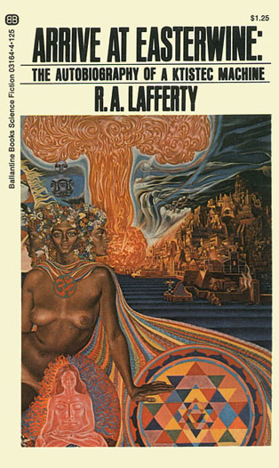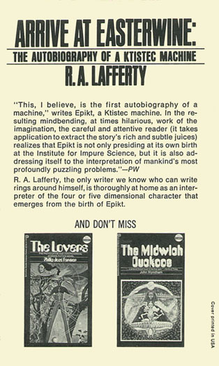 The back cover of ARRIVE AT EASTERWINE by R. A. Lafferty, Ballantine paperback 1973, says "And don't miss".