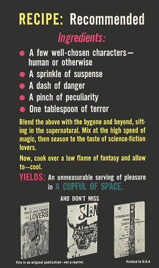 The back cover of CUP FULL OF SPACE by Mildred Clingerman, Ballantine paperback 1961, says "And don't miss".