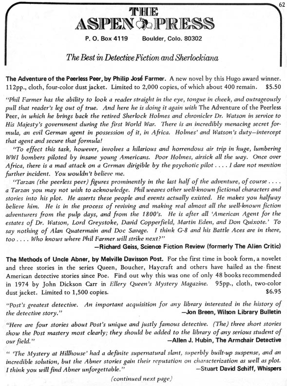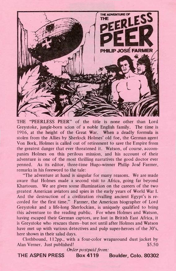 This ad from Aspen Press appeared in Xenophile #11, March 1975. Where this ad or flyer ad or flyer originally appeared is currently unknown.