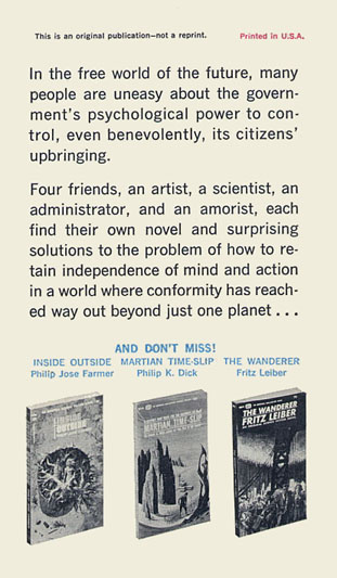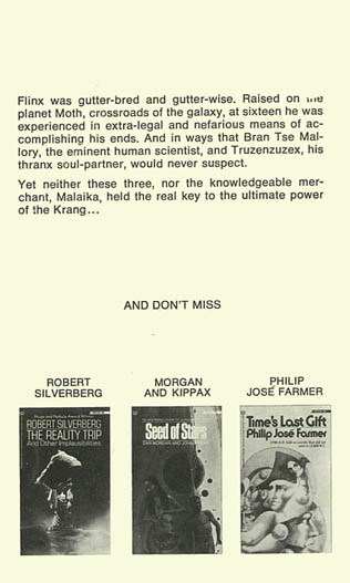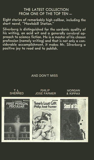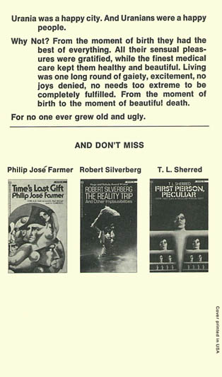 The back cover of THE REALITY TRIP by Robert Silverberg, Ballantine paperback 1972, says "And don't miss".