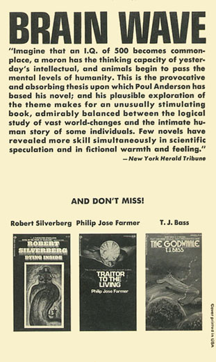 The back cover of BRAIN WAVE by Poul Anderson, Ballantine paperback 1974, says "And don't miss".