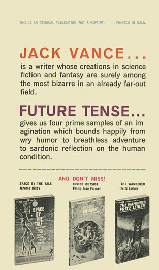 The back cover of FUTURE TENSE by Jack Vance, Ballantine paperback 1964, says "And don't miss".