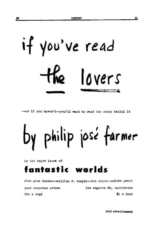 Page 11 of issue #8 (Spring 1953) of the fanzine Destiny has this full page ad for Farmer's article Lovers and Otherwise.
