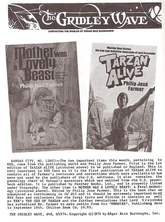 The front page of The Gridley Wave #48, June 1974, has this promo for the first British edition of TARZAN ALIVE and the first edition of MOTHER WAS A LOVELY BEAST and.