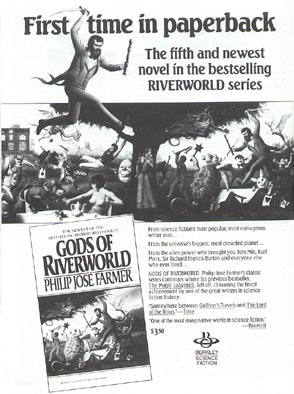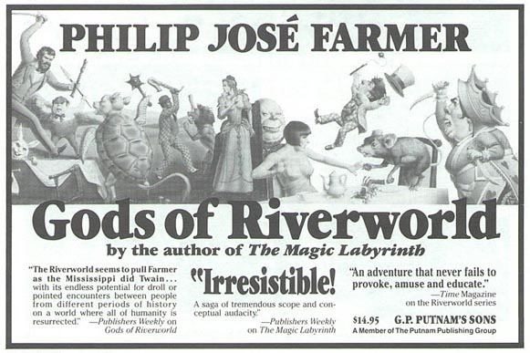 Here is a large newspaper ad for GODS OF RIVERWORLD.