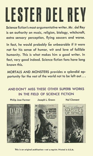 The back cover of MORTALS AND MONSTERS by Lester del Rey, Ballantine paperback 1965, says "And don't miss these other superb works in the field of science fiction".