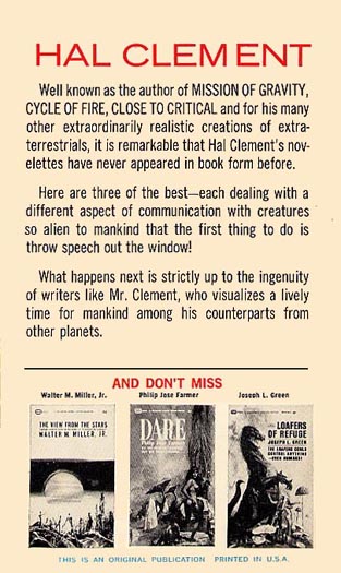 The back cover of NATIVES OF SPACE by Hal Clement, Ballantine paperback 1964, says "And don't miss".