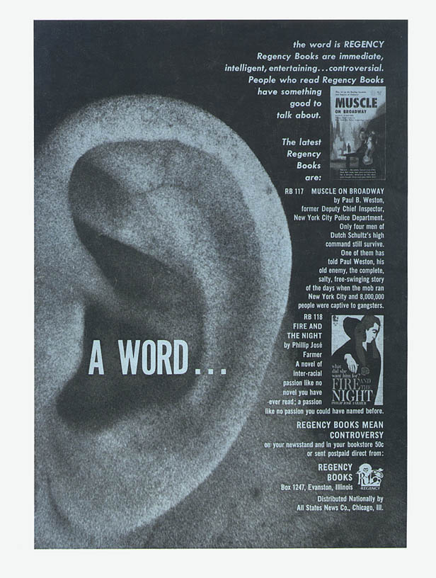 The back cover of Rogue June, 1962 is a full page ad for two books by Regency, including FIRE AND THE NIGHT.
