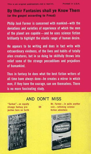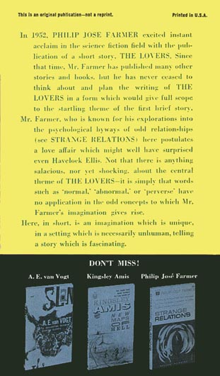 The back cover of THE LOVERS by Philip José Farmer, Ballantine paperback 1961, says "And don't miss".