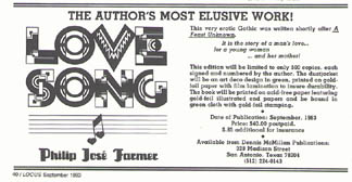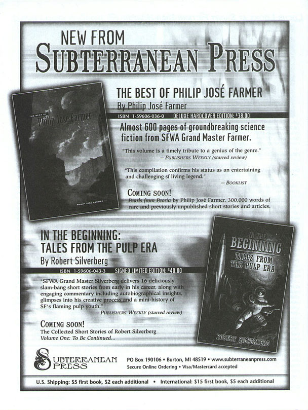 The March 2006 issue of Locus has a full page from Subterranean Press, half of which is for THE BEST OF PHILIP JOSÉ FARMER.