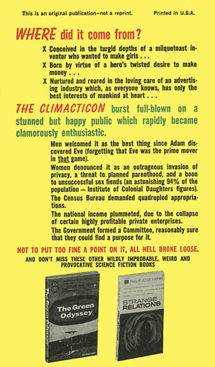 The back cover of THE CLIMACTICON by Harold Livingston, Ballantine paperback 1960, says "And don't miss these other wildly improbable, weird and provocative science fiction books".