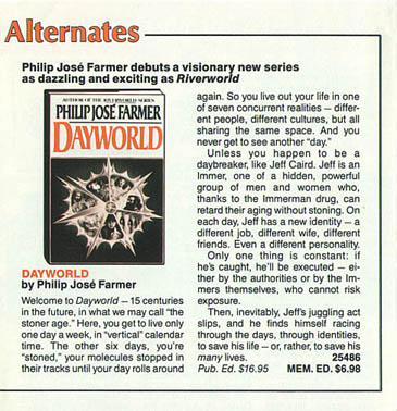 The July 1985 issue of Things to Come from the Science Fiction Book Club lists DAYWORLD as a Featured Alternate.
