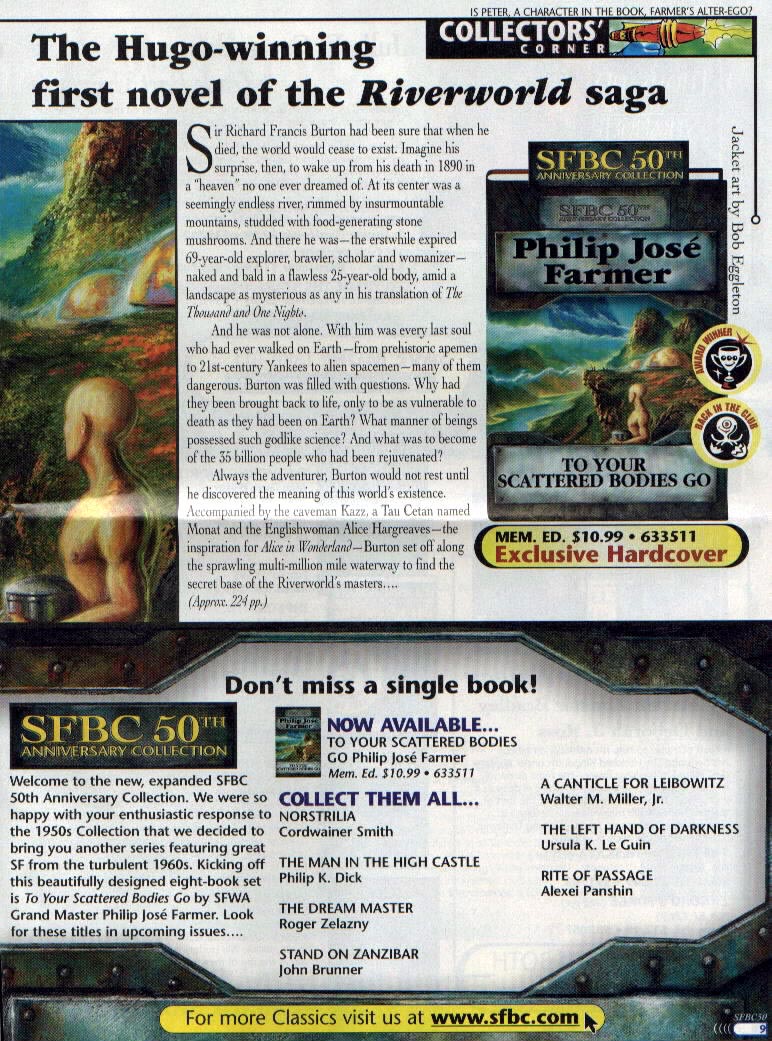 The March 2004 issue of Things to Come from the Science Fiction Book Club lists TO YOUR SCATTERED BODIES GO as a part of the SFBC 50th Anniversary Collection.