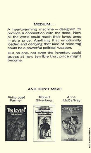 The back cover of TRAITOR TO THE LIVING by Philip José Farmer, Ballantine paperback 1973, says "And don't miss".