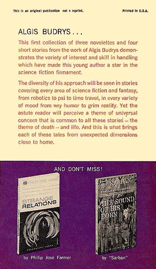 The back cover of THE UNEXPECTED DIMENSION by Algis Budrys, Ballantine paperback 1960, says "And don't miss".