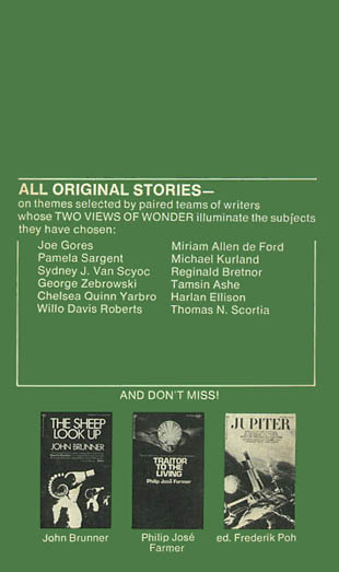 The back cover of TWO VIEWS OF WONDER edited by Thomas N. Scortia and Chelsea Quinn Yarbro, Ballantine paperback 1973, says "And don't miss".
