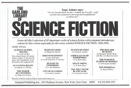Here is a half page ad from the October 27, 1975 issue of Locus (#180), for Garland Press.