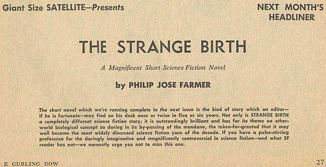 Page 27 of the May 1959 issue has the following promo for The Strange Birth in the next issue. The June issue was never printed and The Strange Birth was finally printed as Open To Me, My Sister in F&SF.