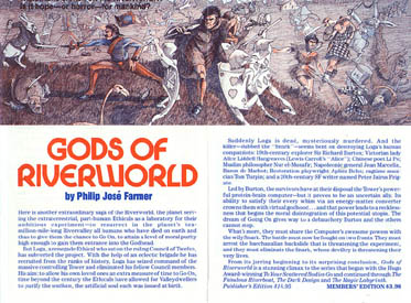 The December 1983 issue of Things to Come from the Science Fiction Book Club has a two page spread for GODS OF RIVERWORLD with a description of the story.