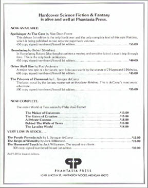 Here is a full page ad for Phantasia Press (including the World of Tiers books) from the July 1983 issue of Locus (#270).