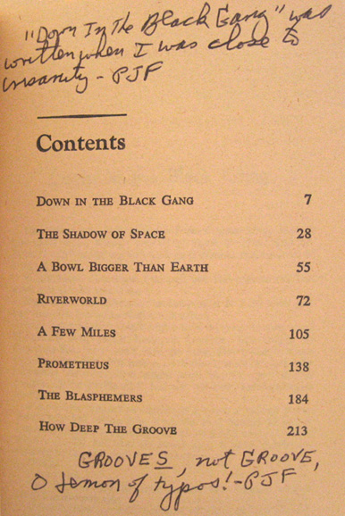 Fellow PJF fan Craig Kimber pointed out that Farmer's earlier signatures had a printed capital J while the later