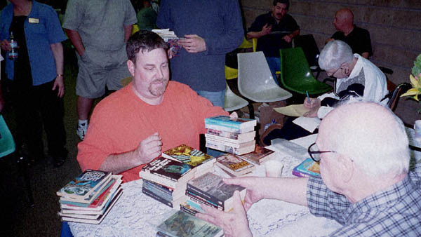 Next, Phil started what was referred to as his favorite indoor sport, signing books... what must have seemed like an endless stream of books, magazines and other items related to his work. While he was signing, Bette was looking at concept art from a project that James De V. Mansfield is working on. After the line finally ran out, Phil took a few minutes to look through Rick Beaulieu's collection of foreign editions, most of which Phil said he didn't remember ever seeing the cover art for.