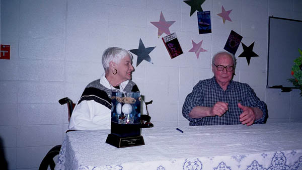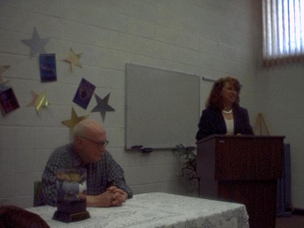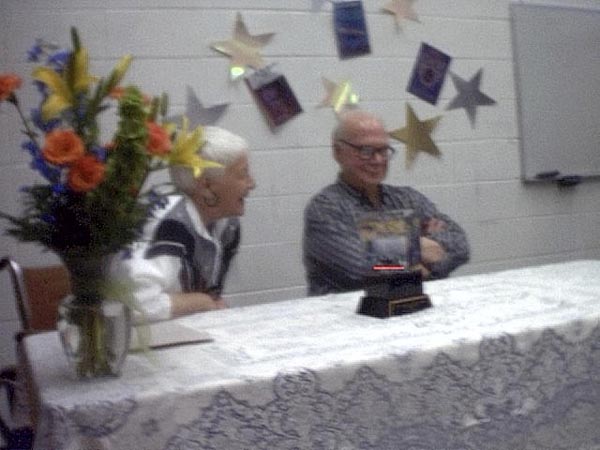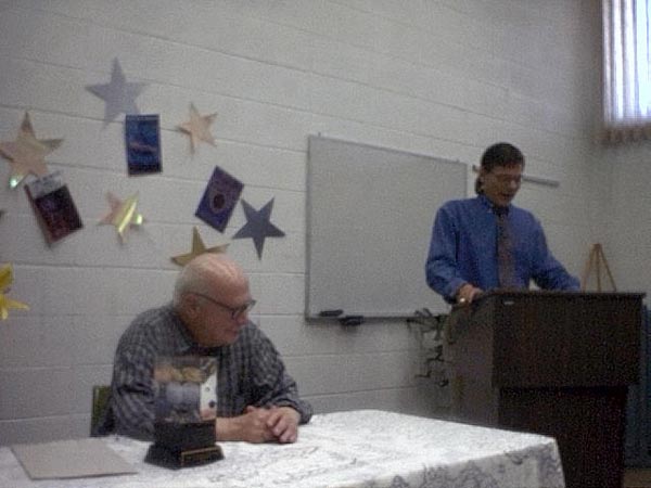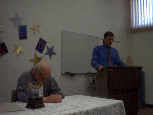 The reception started at 1:00pm with an introduction by Maggie Nelson, followed by presentations from Gloria Harp representing the Illinios State House of Representatives and others. Sue Herring read a proclamation from the Mayor of Peoria, and Tracy Knight read Harlan Ellison's presentation speech from the Nebula Awards banquet. Phil sat uncomfortably while the speakers went on and on about his achievements.