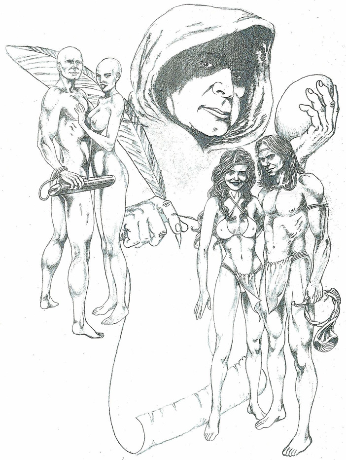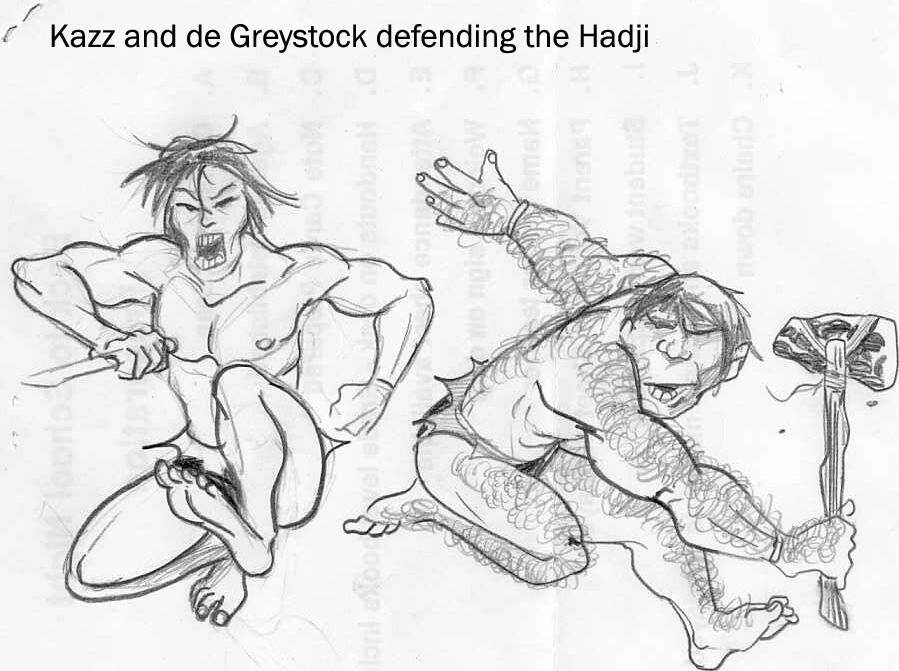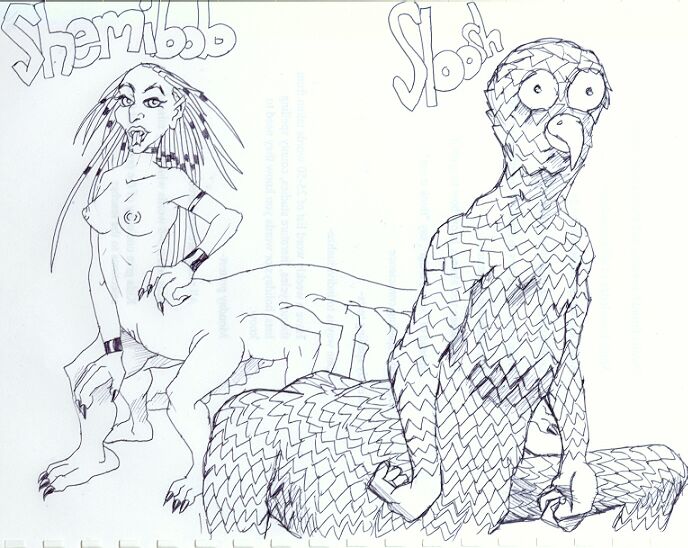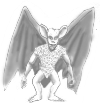 I drew a couple of quick sketches after reading Stone God Awakens based on PJF's descriptions. One of the bat winged folk and a snoligaster from the magnificent chase scene in the tree canals. I have enhanced the drawings on the computer for this fan art page. Mario Zecca 3-7-03 mz@bestweb.net.