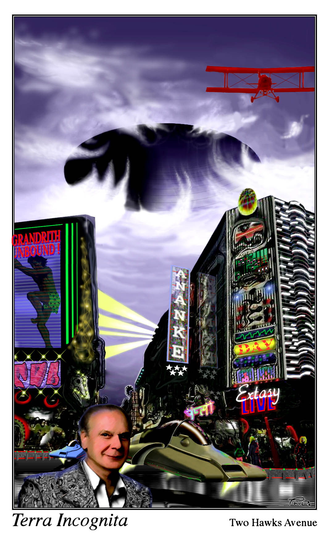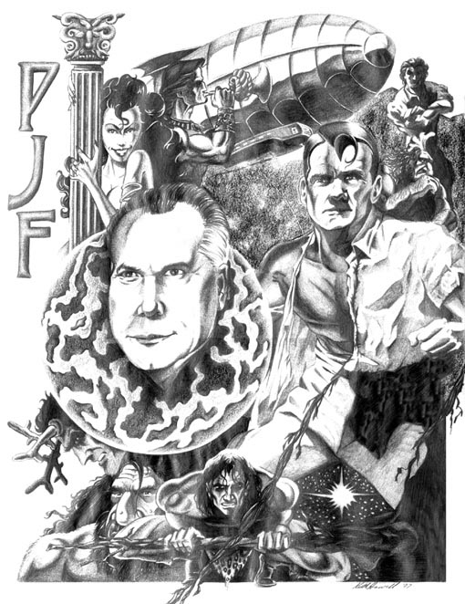 Starting at top left and going right then down then back left then up you will see Anana and behind her, Kickaha blowing the horn of Jadawin from World of Tiers. Then a dirigible, included because Philip Jose Farmer works one into so many of his stories. Next is Sharts and Blogo from A Barnstormer in Oz. Then Doc Caliban, Lord Grandrith, Joe the neanderthal from the Riverworld books. Then a profile shot of Commander Stagg behind a view of the Riverworld with PJF's face imposed on top.