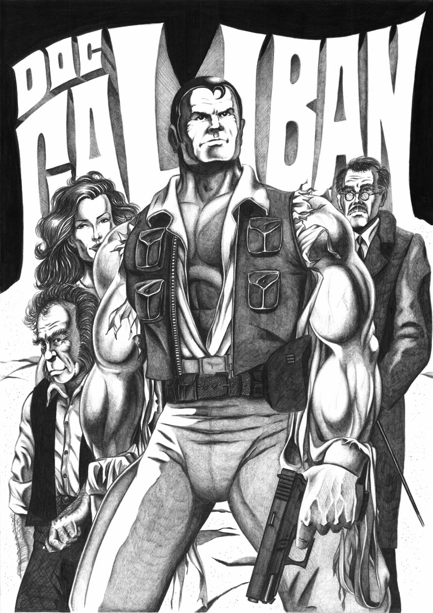 A standard pose of Doc, Pauncho, Barney, and Trish. To further drive home the Doc Caliban/Doc Savage pastiche, I even took the familiar Doc Savage logo and converted it to "Doc Caliban" and carved it into stone for the background. For Pauncho and Barney, I wanted to evoke Monk and Ham, but make them seem more "real" physically. I also aged them a bit, which gave them both more character as drawings. Trish was simply based on a tall model that I once saw and noted her cheek structure and eyes. I felt she exemplified Phil's descriptions of Trish.