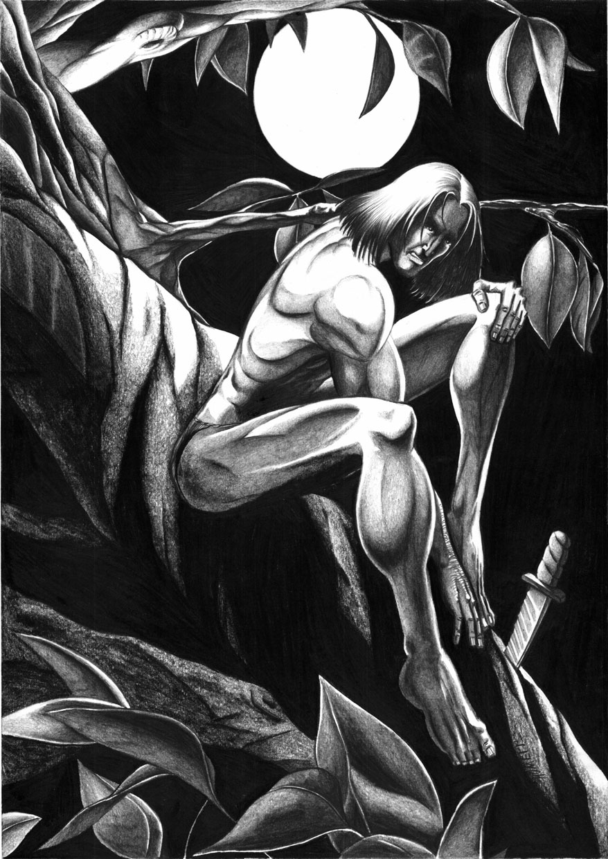 In this portrait, I used the bright full moon as the light source for the image. Since Lord Grandrith is "Lord of the Trees," I felt it imperative to place him in a tree. I sketched around with ideas such as letting loose his guttural yell or swinging from tree to tree. I settled on this image of the noble savage reclining in the tops of the trees late in the evening.
