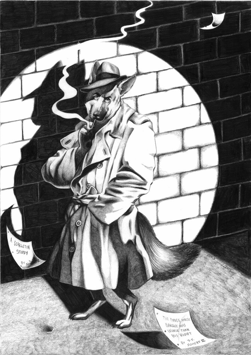 My inspiration for the portrait was an old Sam Spade publicity shot of Humphrey Bogart. I even scrounged up a couple of good black and white photos of Bogie's face that I used as reference for Ralph's face. Working from a couple of German Shepherd photos, I tried to keep Ralph looking like a dog with HINTS of Bogie in his face. If you look carefully at Ralph's eyes, you'll see that they aren't dog eyes but Bogie's eyes. I think that odd conflation of features makes Ralph very appealing as a portrait and illustration.