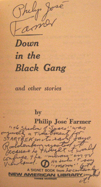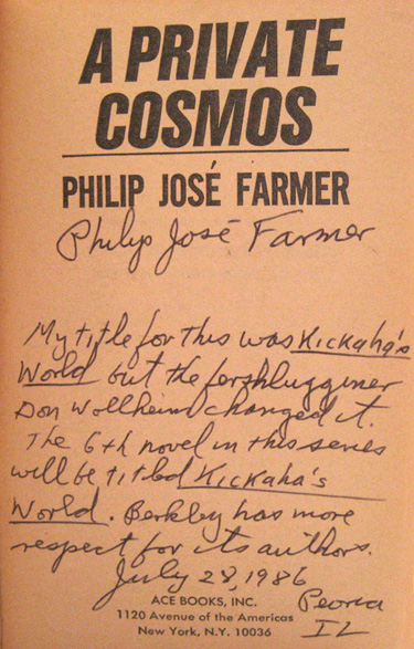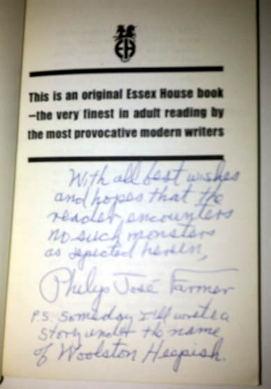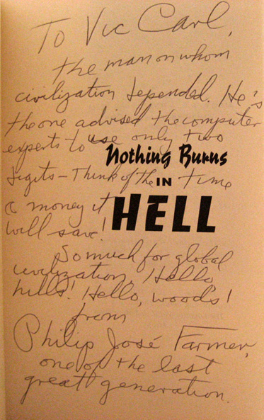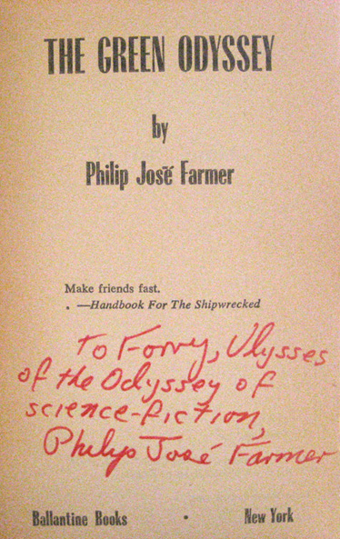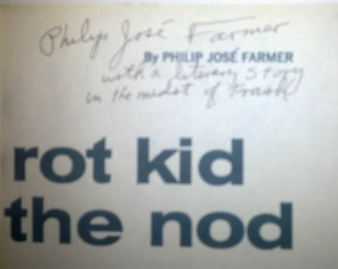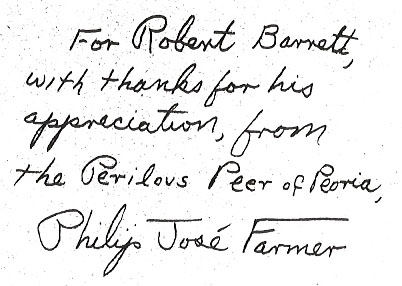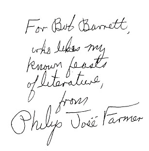 We have had several (ok three) requests to verify that a signature in a book is actually that of Philip José Farmer.