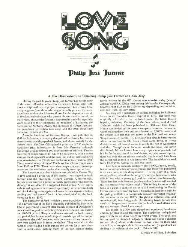 This book was originally submitted to Essex House (IMAGE OF THE BEAST, BLOWN, A FEAST UNKNOWN) but they went out of business before it was printed. Jack Weston has some unusual sexual adventures with a beautiful young woman, and her mother. He barely escapes with his life. The two hardcover dust jackets are foil and very hard to scan. The first state jacket is gold foil, the lines and notes are in dark green with a lighter green shadow. The second state jacket is a lighter foil color and the lines, notes and lettering are in the lighter green color with no shadows. As far as we can tell, there is no set pattern as to which books have the 1st state jacket: (4, 9, 72, 121, 128, 146, 228, 276, 397, 456, 477, 483) and which have the 2nd state jacket: (90, 190, 194, 279, 301, 336, 347, 349, 365, 376, 412). If you have a copy of the hardcover, please email Mike with the number and dust jacket state.