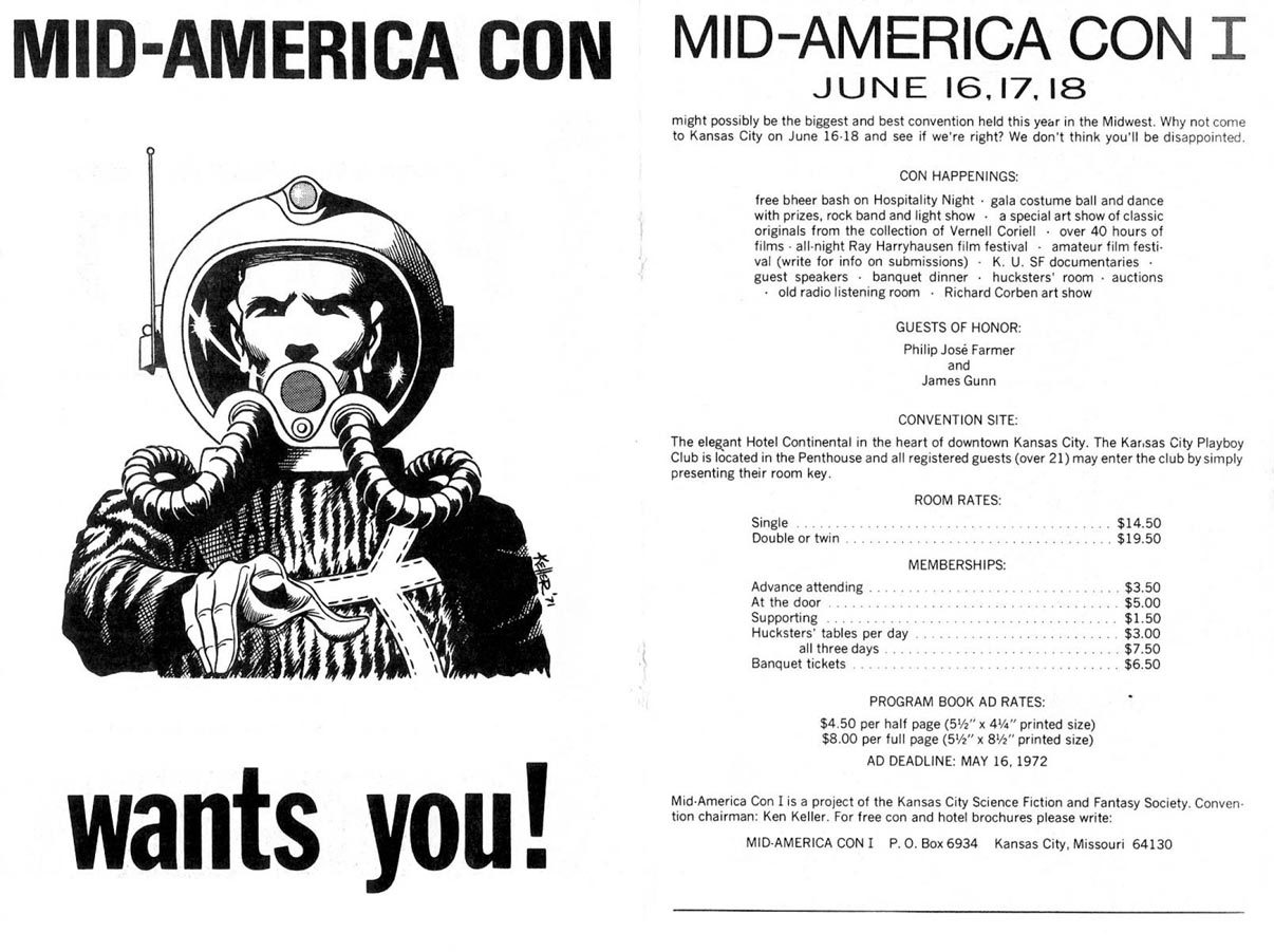 Philip José Farmer and James Gunn were the guests of honor. There is a one page article about Phil by Vernell Corniell in the program. From Locus #115 June, 23 1972: ... Highpoint of the convention, and very well attended, was the Saturday night banquet featuring Phil Farmer's speech, a surprise reading of a just-completed short story about an eye-witness to King Kong's escapades ...