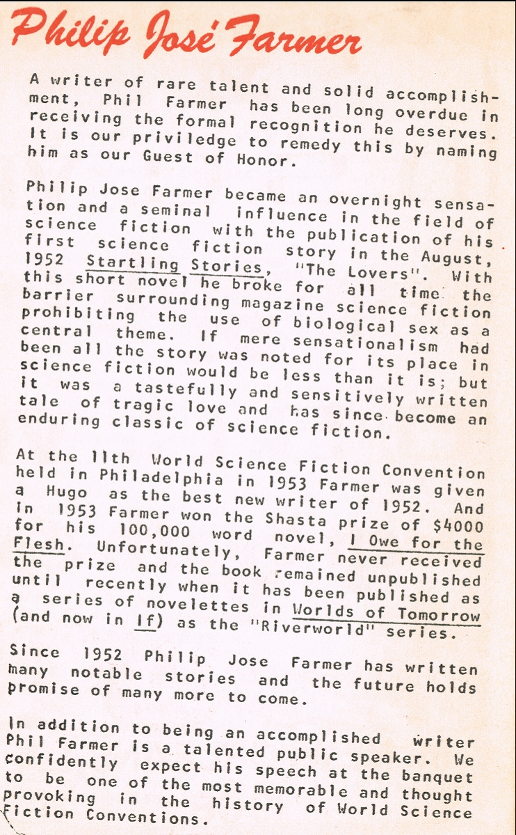 Philip José Farmer was the guest of honor, there is a bio of him in the program by Frederick Pohl.