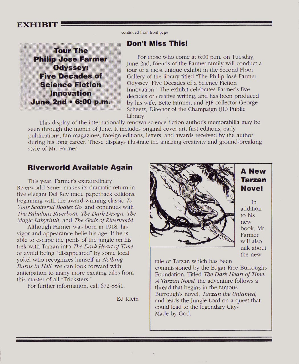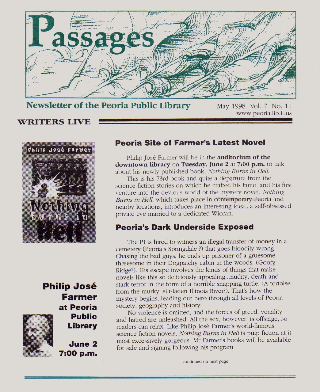 While the exhibit of Farmer memorabilia at the library lasted the whole month of June, it was on the 2nd that Phil came and gave a talk and signed copies of his Peoria based mystery novel, NOTHING BURNS IN HELL. The second page of the Newsletter also talks his forthcoming Tarzan novel and the latest edition of the Riverworld books.