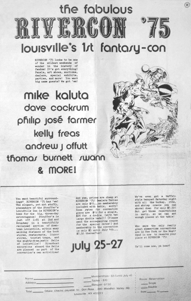 Philip José Farmer was the guest of honor. This was the first RiverCon convention, and it was also DeepSouthCon XIII.Apparently DeepSouthCon floats around like the WorldCon does. Farmer was the guest of honor and gave the speech "Now it Can Be Told, the truth about Kilgore Trout".