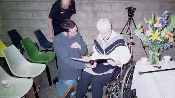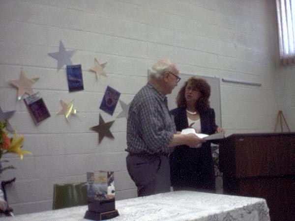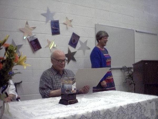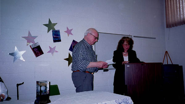 The reception started at 1:00pm with an introduction by Maggie Nelson, followed by presentations from Gloria Harp representing the Illinios State House of Representatives and others. Sue Herring read a proclamation from the Mayor of Peoria, and Tracy Knight read Harlan Ellison's presentation speech from the Nebula Awards banquet. Phil sat uncomfortably while the speakers went on and on about his achievements.