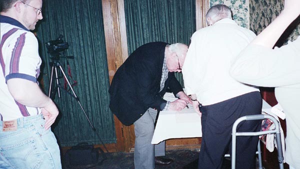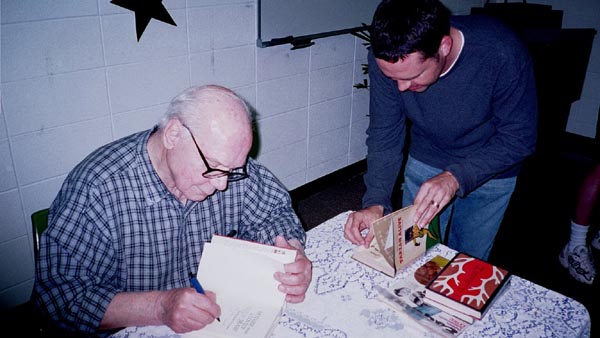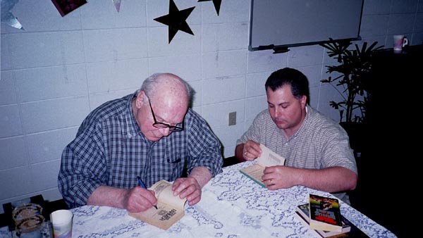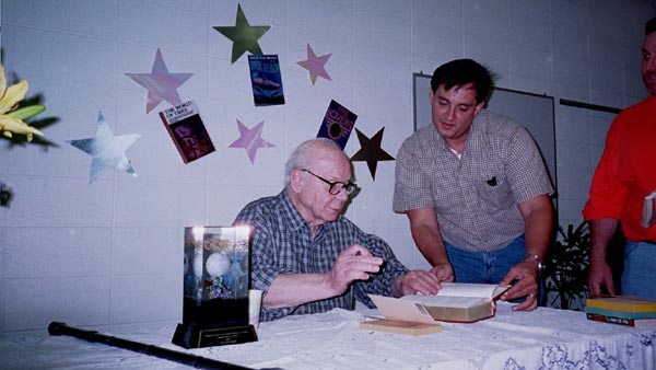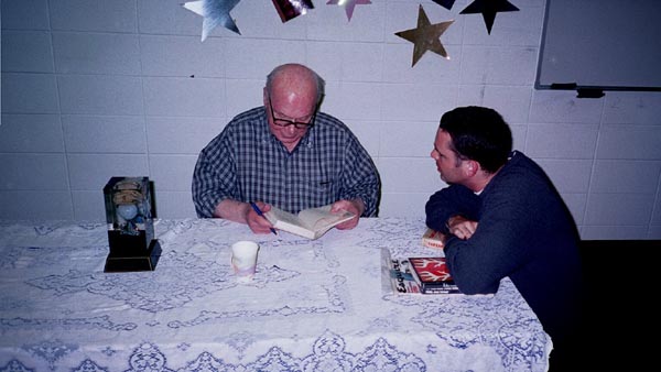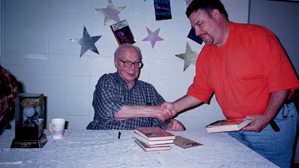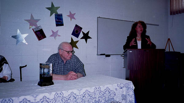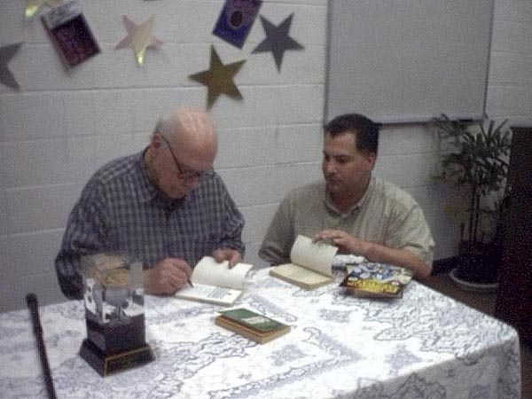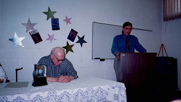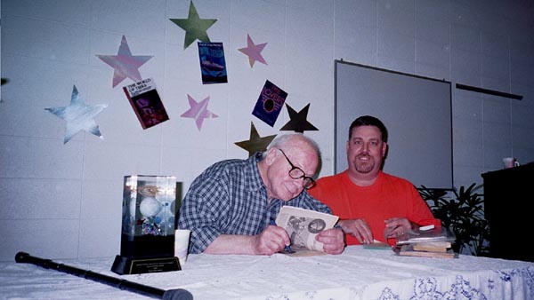 On May 19th, 2001 the Peoria Public Library held a Living Legend Reception for Philip José Farmer in celebration of his having been awarded the Grand Master Award at the Nebula Award Banquet on Saturday April 28, 2001, The award was presented to him by Harlan Ellison. Mike Croteau had helped to arrange it so that many of us serious-to-rabid collectors had all of the information necessary to make plans to attend not only the reception but also to have dinner with Phil and his wife Bette later that evening.
