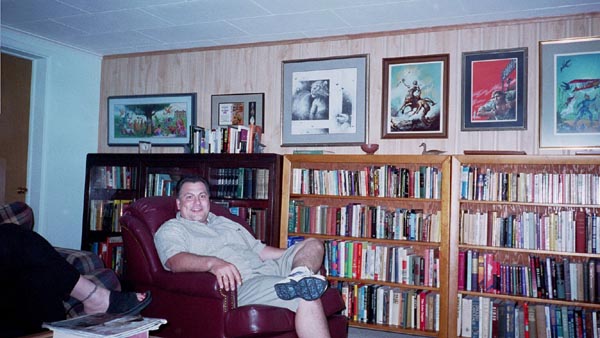 After the reception was over Phil was going to rest for a couple of hours before going out to dinner with the group. Bette graciously invited the group to come to their house, to watch the tape that had been made at the Nebula Awards banquet while we waited. These pictures show some of Phil's personal library and his collection of the artwork used on his book covers.